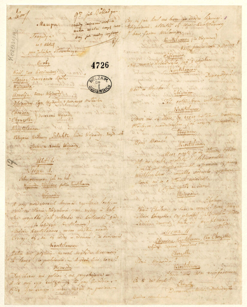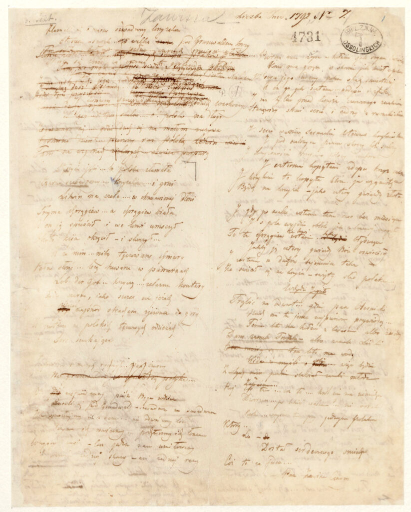 W Dziale Rękopisów Biblioteki Ossolineum przechowywane są najcenniejsze rękopisy Juliusza Słowackiego, jednego z najważniejszych przedstawicieli polskiego romantyzmu. W okresie międzywojennym mówiono wręcz o Ossolineum jako o Domu Słowackiego, ze względu na ilość i różnorodność zachowanych utworów. Fantazy, Mazepa, Król-Duch, czy Album rysunkowe z podróży na Wschód to jedynie wybrane tytuły spośród licznych utworów dramatycznych, lirycznych, czy pism filozoficznych i politycznych pisarza, którymi Ossolineum może się szczycić. Rękopisy to nie tylko pamiątki, ale i źródło autorskich tekstów, do dziś budzące zainteresowanie badaczy i wydawców, dlatego ważną rolą Zakładu jest zabezpieczanie i upowszechnianie ocalałej spuścizny.