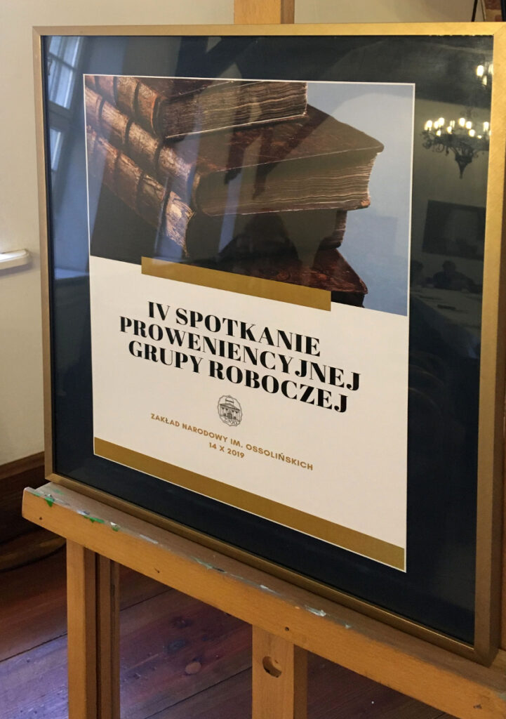 14 października 2019 roku w Zakładzie Narodowym im. Ossolińskich odbyło się czwarte spotkanie Proweniencyjnej Grupy Roboczej. W seminarium uczestniczyło ponad trzydziestu przedstawicieli z następujących polskich instytucji: Biblioteki Jagiellońskiej, Biblioteki Gdańskiej PAN, Biblioteki PAU i PAN w Krakowie, Biblioteki Poznańskiego Towarzystwa Przyjaciół Nauk, Biblioteki Śląskiej, Biblioteki Uniwersytetu Śląskiego, Bibliotek Uniwersyteckich w Poznaniu, Warszawie, Wrocławiu, Fundacji im. Zofii i Jana Włodków, Instytutu Historii Nauki PAN, Instytutu Badań Informacji i Komunikacji UMK w Toruniu, Książnicy Pomorskiej, Narodowego Instytutu Muzealnictwa i Ochrony Zbiorów, Wojewódzkiej Biblioteki Publicznej im. E. Smołki w Opolu, Wydziału Historii UAM i Ossolineum. Oprócz badaczy zajmujących się kwestią proweniencji w książce dawnej drukowanej i rękopiśmiennej w spotkaniu wzięli udział także specjaliści z tej dziedziny w zakresie muzealnictwa. Przybyłych powitał wicedyrektor Ossolineum, dr Mariusz Dworsatschek. Podkreślił on, że obecność tak wielu przedstawicieli bibliotek wskazuje, jak ważne są badania proweniencyjne nie tylko starych druków, ale też druków nowych z XIX i XX wieku, rękopisów i innych rodzajów zbiorów.