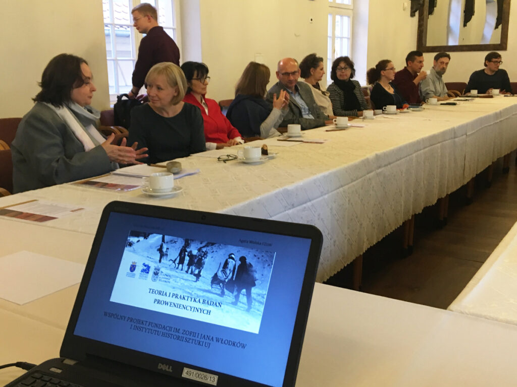 Pierwsza część seminarium poświęcona była badaniom proweniencyjnym w muzealnictwie. Doktor Agata Wołkowska-Wolska z Fundacji im. Zofii i Jana Włodków wygłosiła referat przygotowany wraz z dr. hab., prof. UJ Markiem Walczakiem z Instytutu Historii Sztuki Uniwersytetu Jagiellońskiego pod tytułem Teoria i praktyka badań proweniencyjnych, wspólny projekt Fundacji im. Zofii i Jana Włodków i Instytutu Historii Sztuki Uniwersytetu Jagiellońskiego. Na początku przedstawiła cele i działalność Fundacji Z. i J. Włodków, która zajmuje się gromadzeniem archiwaliów i pamiątek związanych z ziemiaństwem polskim. Majątki rodzinne zostały po wojnie skonfiskowane, wiele z nich przez lata uległo zniszczeniu, a ocalałe budynki i przedmioty nie zostały zwrócone pierwotnym właścicielom. Dzieła sztuki ze zbiorów prywatnych znalazły się w muzeach, wiele zmieniło miejsce przechowywania bądź też zaginęło w czasie wojny. Badania proweniencyjne prowadzone w instytucjach pozwalają na ustalenie pochodzenia przedmiotów już znajdujących się w zbiorach, zidentyfikowanie dzieł na aukcjach, a także prześledzenie losów poszczególnych zabytków, czasem już nieistniejących (określanie strat). Prowadzone badania i ustalenia mogą też pomóc w odzyskaniu dzieł przez pierwotnych właścicieli, czasem w atmosferze sensacji. Portale internetowe, programy telewizyjne mają ukazać właśnie taką stronę badań pochodzenia dzieł sztuki, ich autorstwa czy pochodzenia. A. Wołkowska-Wolska poruszyła także kwestie metodologii badań proweniencyjnych. Najważniejszymi zadaniami stojącymi przed badaczami jest obecnie uporządkowanie terminologii i utworzenie bazy proweniencyjnej. Istotne jest także nauczanie metod badań proweniencyjnych, które, niestety, nie są przedmiotem nauki podczas studiów. By uzupełnić tę lukę, Fundacja im. Z. i J. Włodków i Instytut Historii Sztuki organizują kursy dotyczące metod proweniencyjnych dla muzealników. Rezultaty prac Fundacji prezentowane są w publikacjach drukowanych, a także na stronach internetowych.