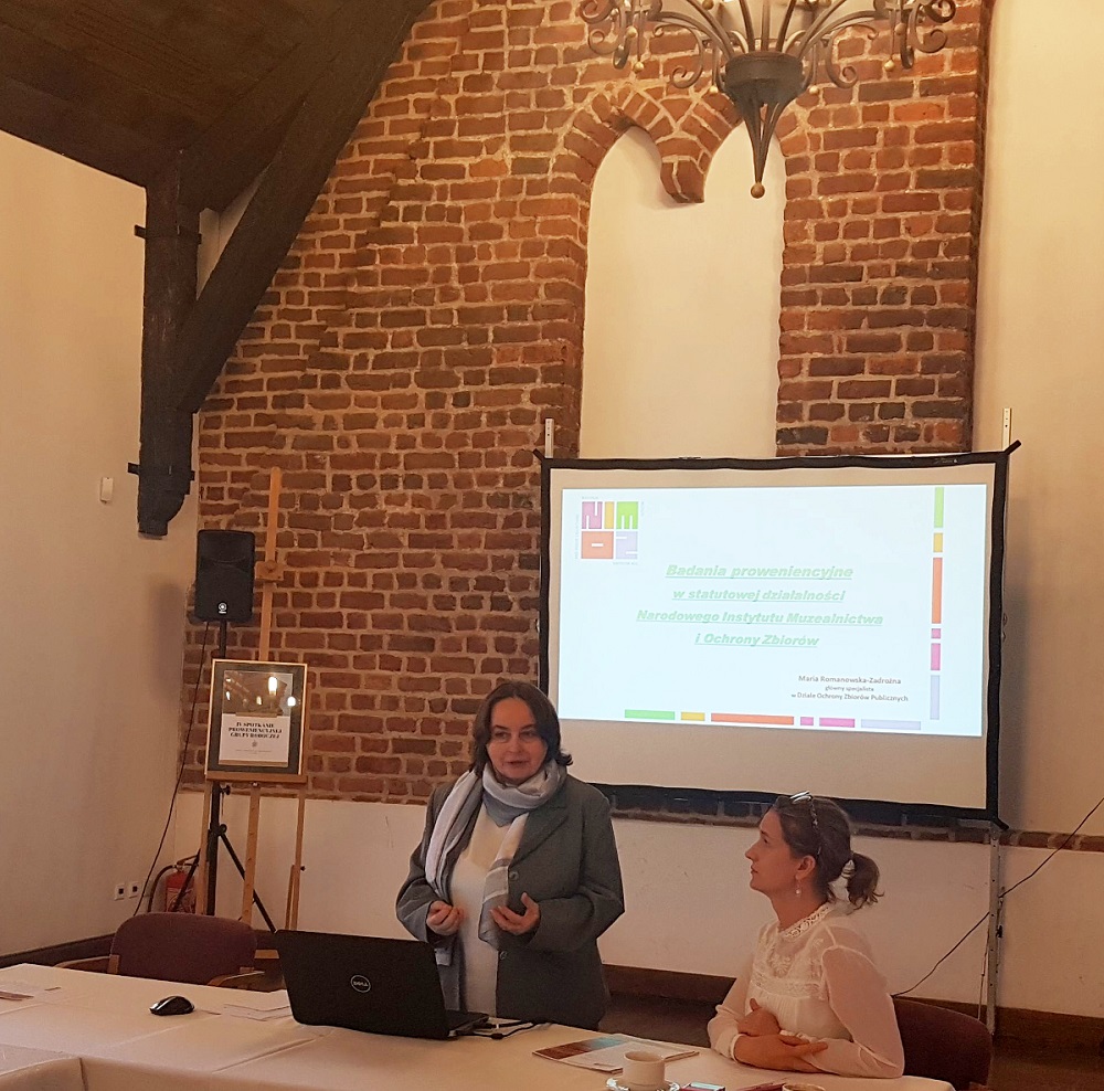 Efekty prac prowadzonych w zakresie proweniencji muzealiów zaprezentowała Maria Romanowska-Zadrożna z Narodowego Instytutu Muzealnictwa i Ochrony Zbiorów. Instytut, który zajmuje się różnymi problemami ochrony zabytków, prowadzi także badania proweniencyjne, organizuje szkolenia w tym zakresie oraz zarządza ogólną bazą wiedzy omawiającą różne aspekty organizacji i działalności muzeów (zarządzanie zbiorami, zalecenia, ochrona i zabezpieczenia, konserwacja, straty), w tym też badania proweniencyjne. NIMOZ upowszechnia również wiedzę o muzeach i zabytkach poprzez publikacje w kilku seriach, między innymi: Biblioteka NIMOZ, Szkolenia NIMOZ, Ochrona Zbiorów, a także czasopisma „Muzealnictwo” i „Cenne, Bezcenne, Utracone”. W serii Szkolenia ukazała się publikacja ABC Podstawy prowadzenia badań proweniencyjnych. W czasopiśmie „Cenne, Bezcenne, Utracone” poruszana była także tematyka zbiorów książkowych i ich losów.
