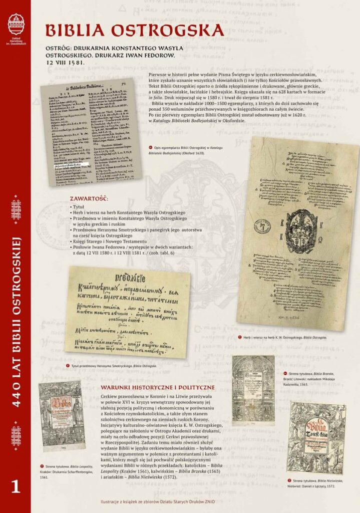 Wystawa zorganizowana przez Bibliotekę Ossolineum z okazji 440 rocznicy pierwszej pełnej edycji Pisma Świętego w języku cerkiewnosłowiańskim, którą od miejsca wydania nazywano Biblią Ostrogską.